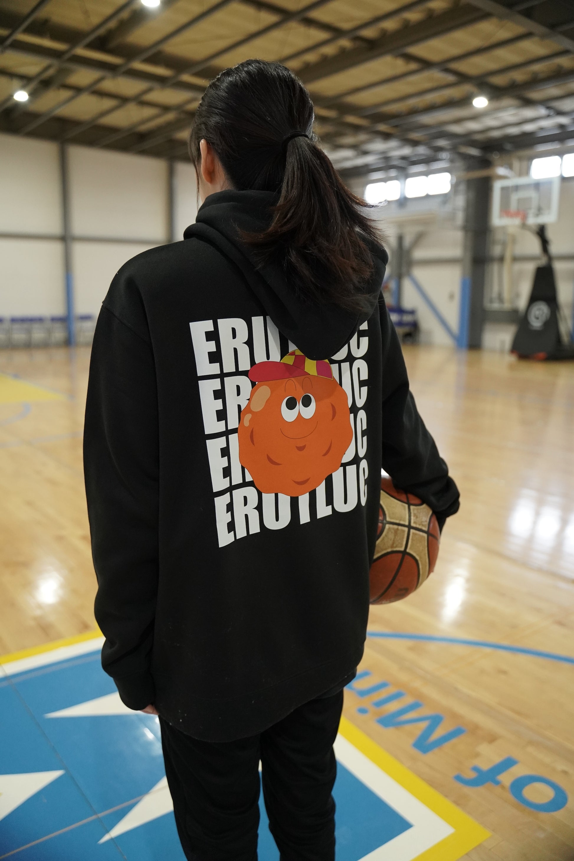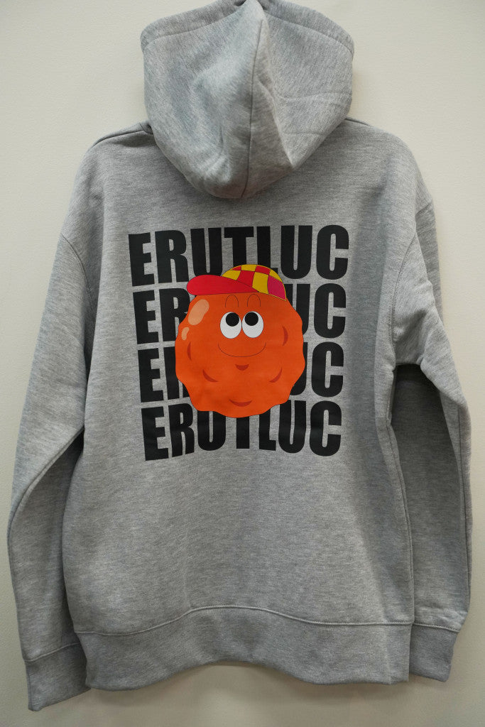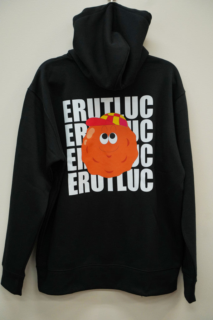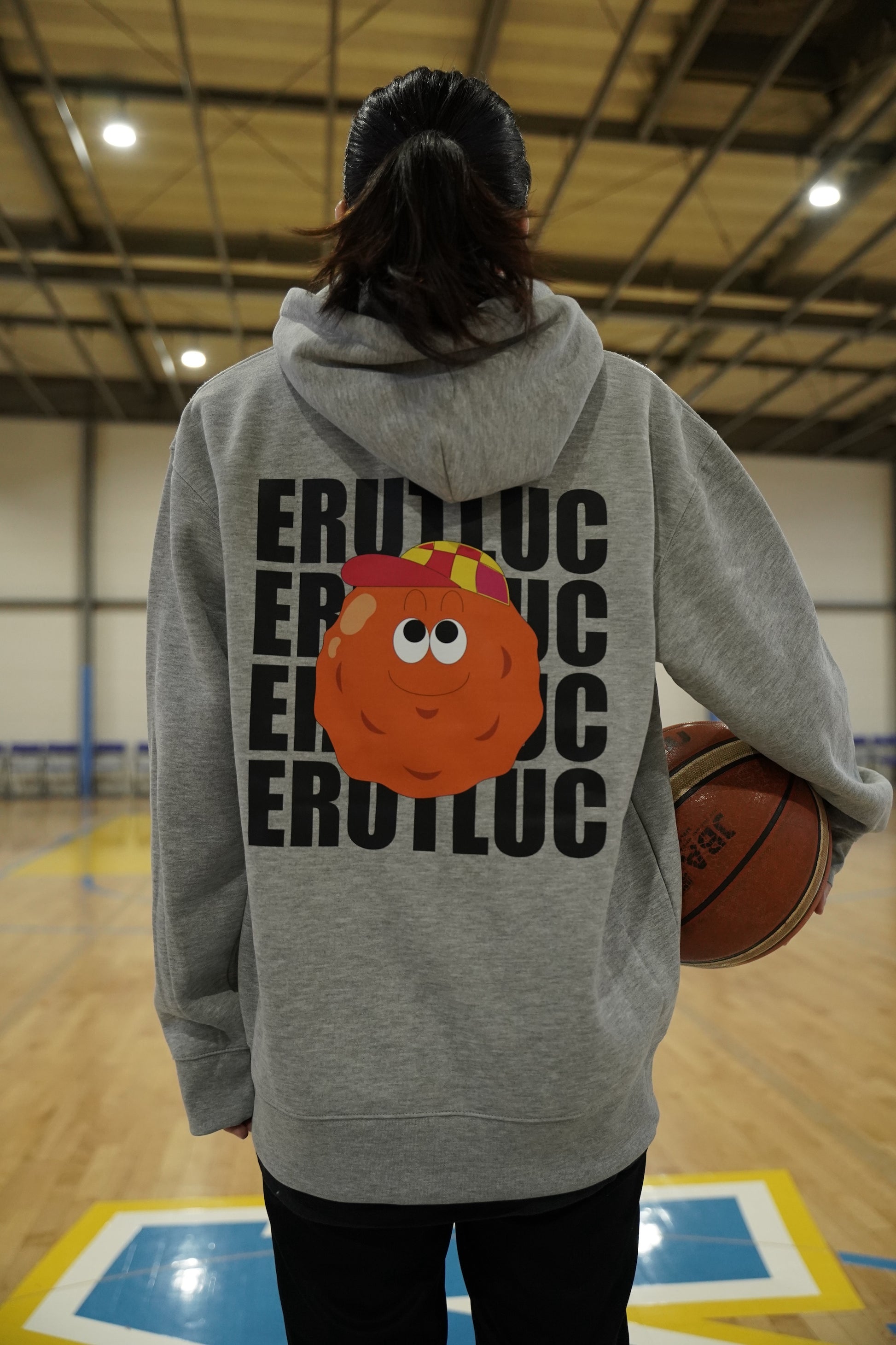 ERUTLUCオリジナルキャラクターのミートボールくんをBACKにプリントしたオリジナルロゴをプリントしたパーカー。