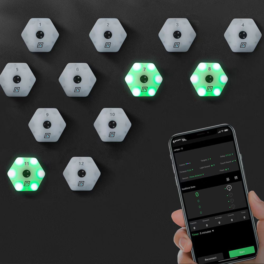 スマートフォンに専用アプリをダウンロードして、最大12個のランプ(※注)を操作し、20種類以上のトレーニングモードを選べます。アプリは日本語対応でマニュアルも付いていて操作は簡単。