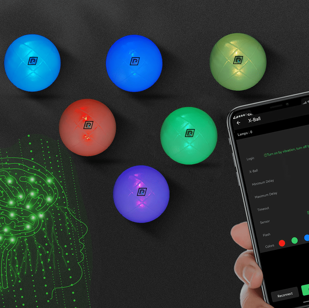 ボールをバウンドさせて青く光ったら右手で取る、赤く光ったら左手、緑に光ったら両手など、ルールを決めて反射神経を鍛えます。