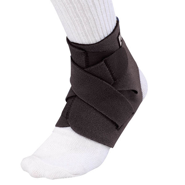 伸縮性クロスベルトで固定力を調整できる足首用サポーター。