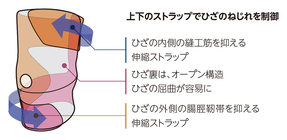 伸縮ストラップがひざの内側の縫工筋と、ひざの外側の腸脛靭帯を抑えます。ひざ裏はオープン構造で、ひざの屈曲が容易に。