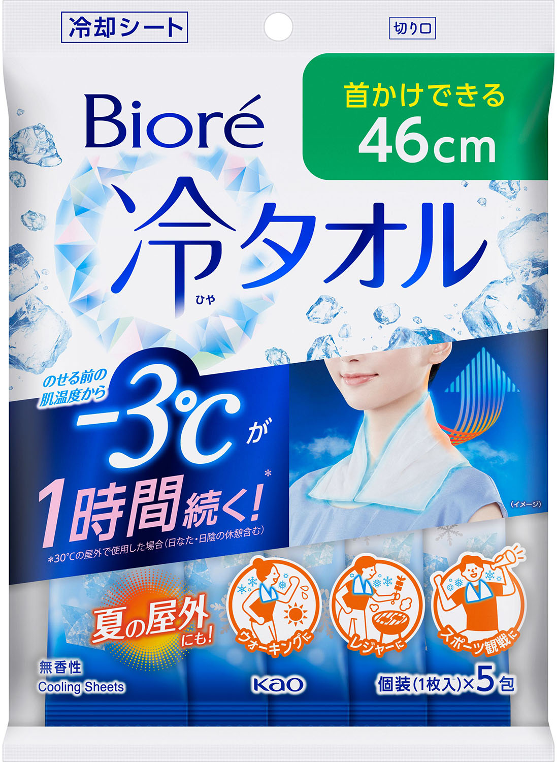のせる前の肌温度から-3℃が1時間続く※冷却シート。※30℃の屋外で使用した場合(日なた日陰の休憩含む)。厚手のシートに含まれるたっぷりの冷却ウォーターが熱を吸い込み蒸発。気化熱の作用で肌の熱(ほてり)を逃がし続ける。長さ46cmで首にかけて使用できる。ウォーキングやレジャー、スポーツ観戦など夏の屋外での活動中もひんやり快適。ヒアルロン酸配合。個包装で持ち運びに便利。1枚入×5包。無香性。