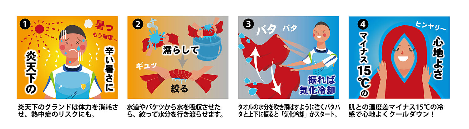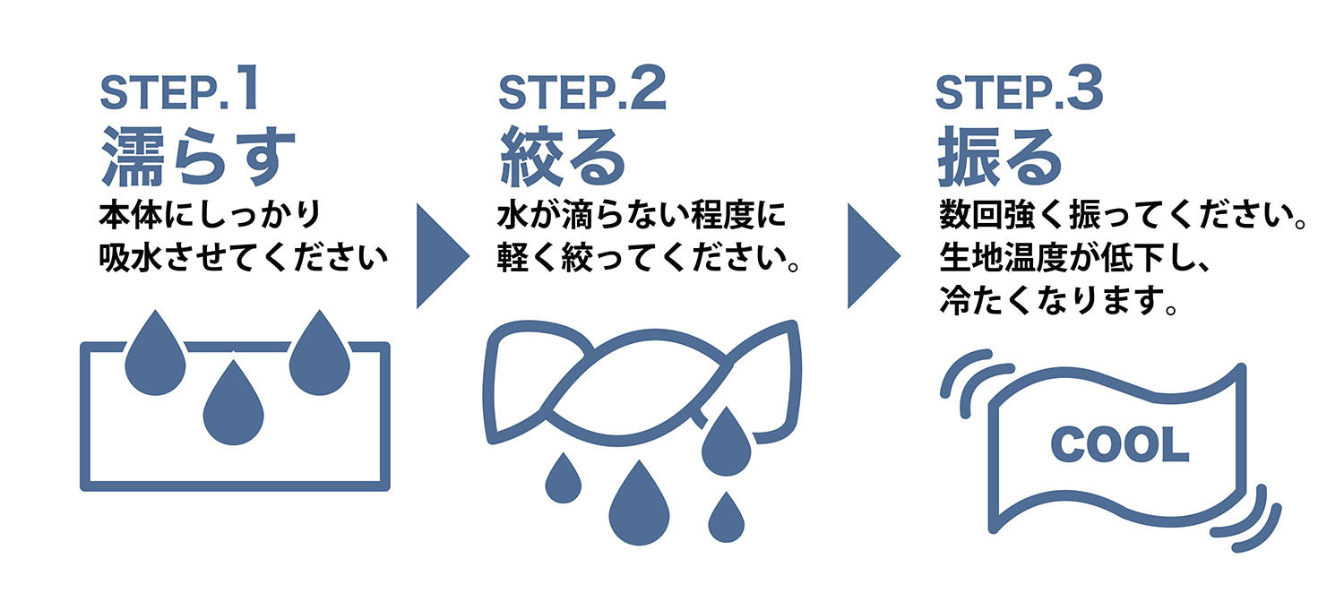水に濡らして、絞って振るだけで何度でも。炎天下やスポーツ後のクールダウンに。大判サイズですっぽりカバー飽きがこないリバーシブルタイプ。濡らす、絞る、振る。簡単3stepですぐにクールダウン。