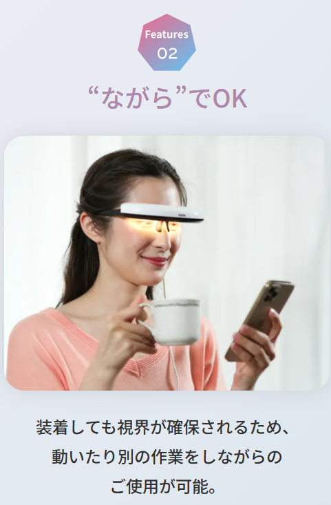 ルーチェグラスはウェアラブル型の高照度光照射装置です。メガネのようにかけて使用するため照射中の自由度が高く、朝の身支度をしながらでも模擬太陽光を浴びることが可能です。 ※実際の太陽光と同じレベルの光を体感できるわけではありません。