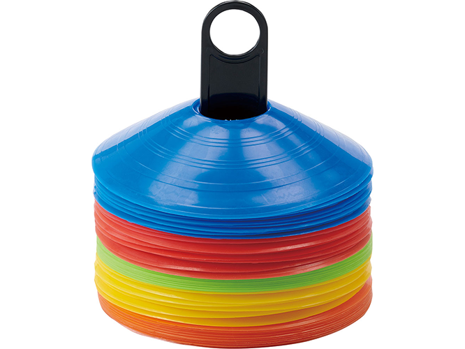 ポリエチレン製のマーカーコーンです。ブルー10枚、レッド10枚、グリーン10枚、イエロー10枚、オレンジ10枚の50枚1組セットです。