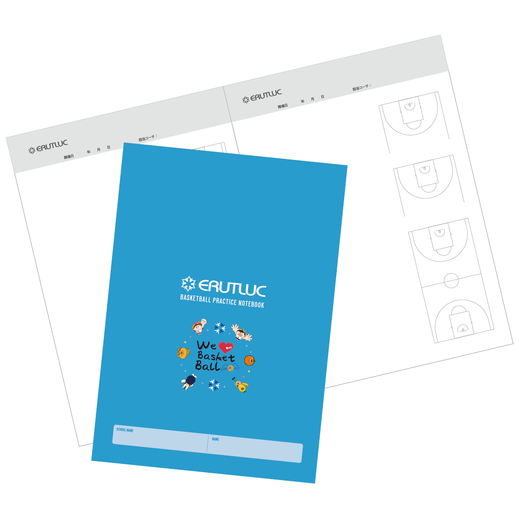バスケットのハーフコート2面とオールコート1面が印刷されたオリジナル仕様で、日々の練習記録にぜひご活用ください。